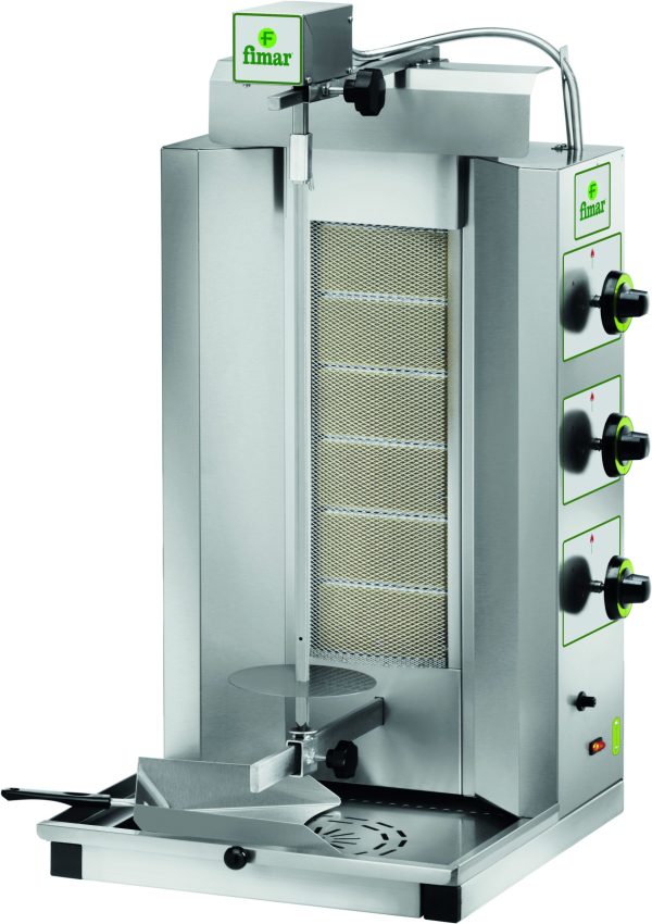 Macchina per cuocere carne per Kebab. Struttura, asta, spiedo e paletta raccogli carne in acciaio inox – bruciatori ad infrarossi con piastra in ceramica – rete protezione bruciatori asportabile – regolazione bruciatori a settori – accensione con piezoelettrico – alimentazione a metano, in dotazione kit GPL – regolazione distanza asta spiedo dalle resistenze – cassetto di raccolta residui di cottura in acciaio inox. Allacciamento gas 1/2“G.