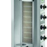 Macchina per cuocere carne per Kebab. Struttura, asta, spiedo e paletta raccogli carne in acciaio inox – bruciatori ad infrarossi con piastra in ceramica – rete protezione bruciatori asportabile – regolazione bruciatori a settori – accensione con piezoelettrico – alimentazione a metano, in dotazione kit GPL – regolazione distanza asta spiedo dalle resistenze – cassetto di raccolta residui di cottura in acciaio inox. Allacciamento gas 1/2“G.