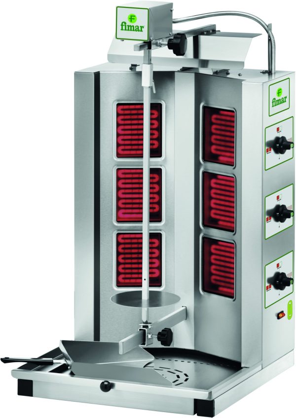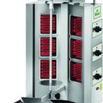 Macchina per cuocere carne per Kebab. Struttura, asta spiedo e paletta raccogli carne in acciaio inox – resistenze ad infrarossi rivestite in ceramica (4 per il modello GYR40 e 6 per il modello GYR60) con vetro di protezione resistente alle alte temperature che ne facilita la pulizia e abbassa i consumi – regolazione resistenze a settori – regolazione distanza asta spiedo dalle resistenze – cassetto di raccolta residui di cottura in acciaio inox – diametro max. carne consentito 470 mm – 3 livelli di potenza.