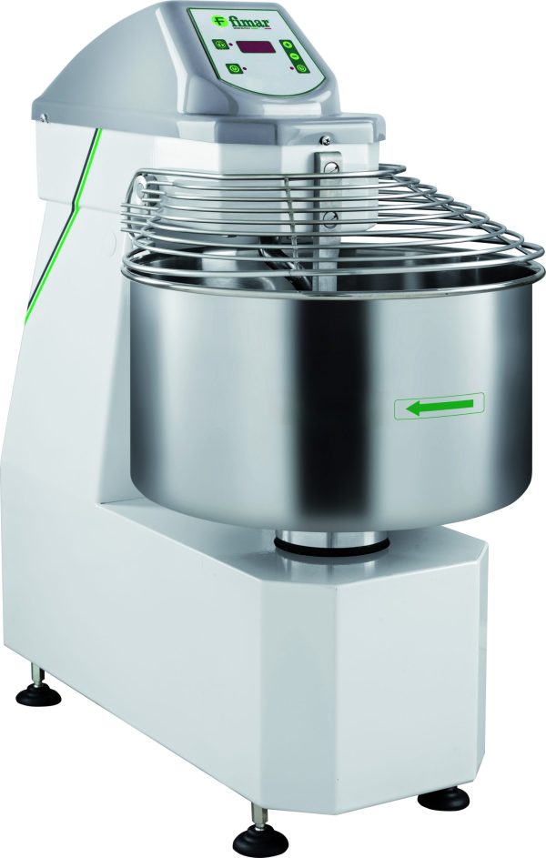 Impastatrice a spirale con testa fissa. Macchina per realizzare diversi tipi di impasto, indicata soprattutto per impasti teneri come pane, pizza e piada. Struttura rivestita con vernice antigraffio – parti a contatto con gli alimenti quali vasca, spirale ed asta spacca pasta sono in acciaio inox – microinterruttore di sicurezza su coperchio vasca – disponibile solo con coperchio grigliato in acciaio inox AISI 304.