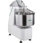 Impastatrice a spirale con testa fissa. Macchina per realizzare diversi tipi di impasto, indicata soprattutto per impasti teneri come pane, pizza e piada. Struttura rivestita con vernice antigraffio – parti a contatto con gli alimenti quali vasca, spirale ed asta spacca pasta in acciaio inox – microinterruttore di sicurezza su coperchio vasca – disponibile solo con coperchio grigliato in acciaio inox AISI 304.