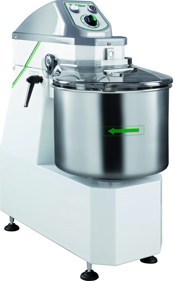 Impastatrice a spirale con testa sollevabile e vasca fissa. Macchina per realizzare diversi tipi di impasto, indicata soprattutto per impasti teneri come pane, pizza e piada. Struttura rivestita con vernice antigraffio – parti a contatto con gli alimenti quali vasca, spirale ed asta spacca pasta sono in acciaio inox – microinterruttore di sicurezza su coperchio vasca – coperchio in policarbonato fumè di serie. Vari optional a richiesta, tra cui coperchio grigliato in acciaio inox AISI 304.