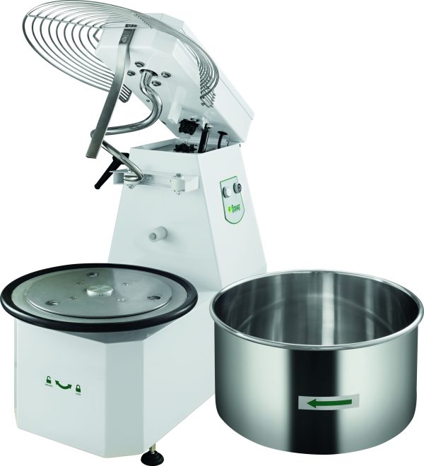 Impastatrice a spirale con testa sollevabile e vasca estraibile. Macchina per realizzare diversi tipi di impasto, indicata soprattutto per impasti teneri come pane, pizza e piada. Struttura rivestita con vernice antigraffio – parti a contatto con gli alimenti quali vasca, spirale ed asta spacca pasta sono in acciaio inox – microinterruttore di sicurezza su coperchio vasca – coperchio in policarbonato fumè di serie. Vari optional a richiesta, tra cui coperchio grigliato in acciaio inox AISI 304.