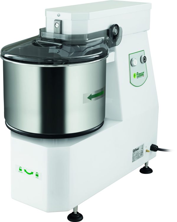 Impastatrice a spirale con testa sollevabile e vasca estraibile. Macchina per realizzare diversi tipi di impasto, indicata soprattutto per impasti teneri come pane, pizza e piada. Struttura rivestita con vernice antigraffio – parti a contatto con gli alimenti quali vasca, spirale ed asta spacca pasta sono in acciaio inox – microinterruttore di sicurezza su coperchio vasca – coperchio in policarbonato fumè di serie. Vari optional a richiesta, tra cui coperchio grigliato in acciaio inox AISI 304.