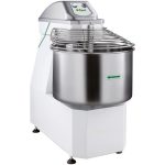 Impastatrice a spirale con testa fissa. Macchina per realizzare diversi tipi di impasto, indicata soprattutto per impasti teneri come pane, pizza e piada. Struttura rivestita con vernice antigraffio – parti a contatto con gli alimenti quali vasca, spirale ed asta spacca pasta sono in acciaio inox – microinterruttore di sicurezza su coperchio vasca – coperchio in policarbonato fumè di serie. Vari optional a richiesta, tra cui coperchio grigliato in acciaio inox AISI 304.