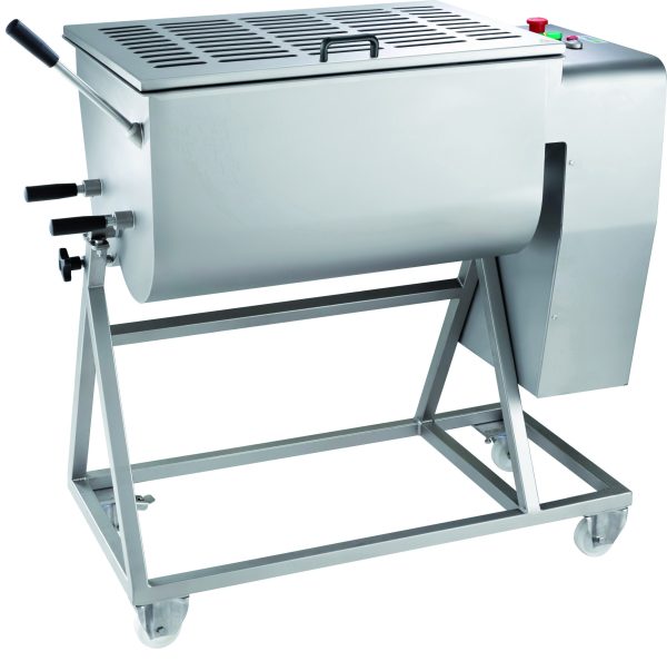 Impastatrici per carne. Struttura interamente in acciaio inox sabbiato – microinterruttore su coperchio – inversione di marcia – pulsante di emergenza – ribaltamento della vasca (110°) per facilitarne lo svuotamento – pale estraibili
