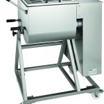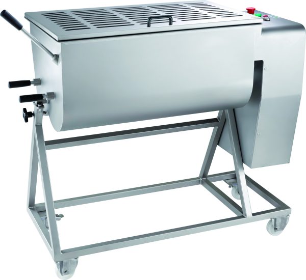 Impastatrici per carne. Struttura interamente in acciaio inox sabbiato – microinterruttore su coperchio – inversione di marcia – pulsante di emergenza – ribaltamento della vasca (110°) per facilitarne lo svuotamento – pale estraibili
