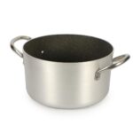 LINEA PROFESSIONALE IN LEGA DI ALLUMINIO SPESSORE 3 MM CON RIVESTIMENTO KERASTON ANTIADERENTE DI ALTA QUALITA’FINITURA ESTERNA IN ALLUMINIO SATINATO.MANICATURA IN ACCIAIO INOX A NERVATURA RINFORZATA.NON ADATTO ALL’INDUZIONE.