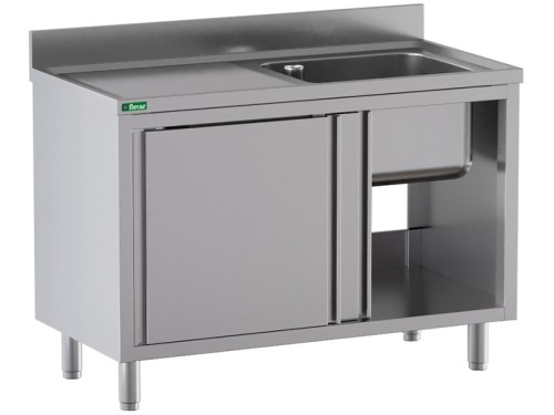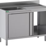 Lavelli armadiati – 1 vasca – con sgocciolatoio – porte scorrevoli – profondità 700 mm. Struttura in acciaio Inox – piano e vasca in acciaio inox AISI 304 – Ripiano inferiore con rinforzo ad Omega – porte scorrevoli tamburate – alzatina h 100 mm – piedini regolabili 0-2 cm- piletta scarico e troppo pieno inclusi.