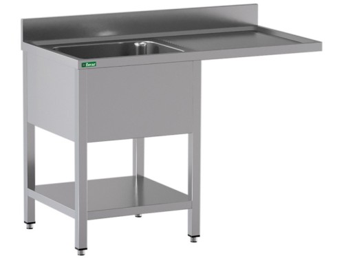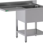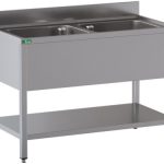 Lavelli a sbalzo – 1 vasca. Struttura in acciaio Inox – piano e vasca in acciaio inox AISI 304 – ripiano inferiore con rinforzo ad Omega – alzatina h 100 mm – piedini regolabili – piletta scarico e troppo pieno inclusi.