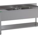 Lavelli aperti – 2 vasche – con ripiano inferiore e sgocciolatoio – profondità 600 o 700 mm.Struttura in acciaio Inox – piano e vasche in acciaio inox AISI 304 – ripiano inferiore con rinforzo ad Omega – alzatina h 100 mm – piedini regolabili – piletta scarico e troppo pieno inclusi.