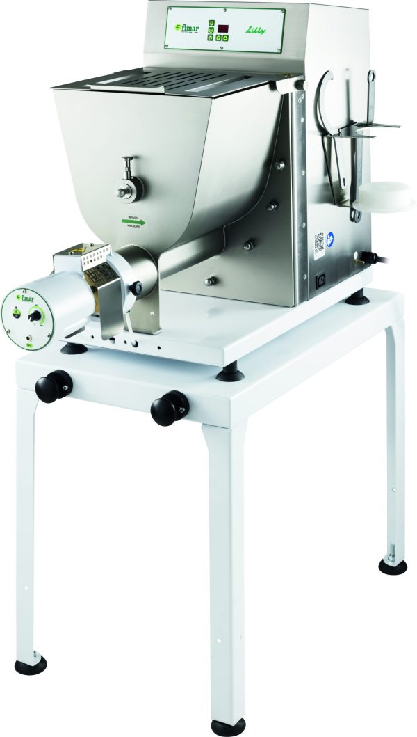 Macchina per la pasta fresca “Lilly” ideale per impastare ed estrudere impasti in diversi formati. Carcassa, vasca, supporto vasca, gancio impastatore ed elica in acciaio inox AISI 304 – microinterruttore su coperchio vasca – coperchio grigliato per permettere l’inserimento di ingredienti anche durante la lavorazione – pannello di comandi digitale – vasca completamente estraibile per un facile e rapido lavaggio – bocca di estrusione con raffreddamento ad acqua – coltello taglia pasta incluso – cavalletto incluso solo per modello PF80E (cod. ACCAVPF80EN0). Accessori: trafile in bronzo di diverso tipo, carrello e cassette porta pasta fresca.