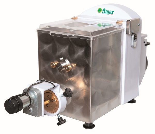 Macchina per impastare ed estrudere impasti all’uovo in diversi formati. Struttura rivestita con vernice antigraffio – vasca e gancio impastatore in acciaio inox AISI 304 – microinterruttore su coperchio vasca – ll modello MPF2.5CN include il coltello taglia pasta elettronico nel prezzo. Accessori: trafile in bronzo di diverso tipo – carrello e cassette porta pasta fresca.