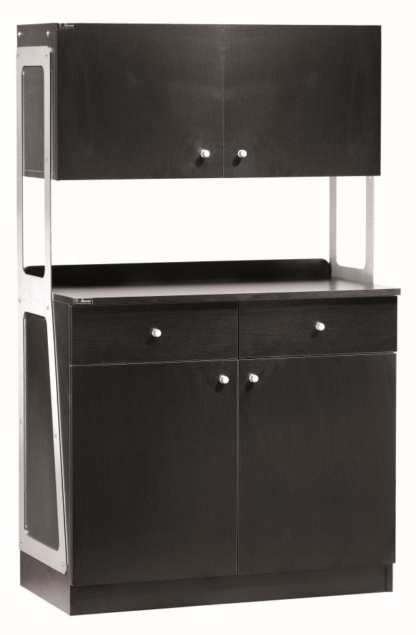 Mobili di servizio alti doppi – struttura e pannelli in nobilitato – struttura reggi pensili in acciaio plastificato – pensili – 2 cassetti portaposate di cui 1 con separatore – 2 sportelli – ruote multidirezionali ø 50 mm. Optional tramoggia A270.