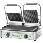 Macchina per cuocere e riscaldare carne, pesce, verdure, toast farciti, panini, ecc. Struttura in acciaio inox – piastra di cottura in ghisa – piastra superiore auto-bilanciata – piastra singola rigata.