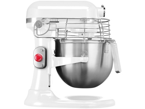 Impastatrice planetaria Kitchenaid. Struttura rivestita con vernice antigraffio bianca – 1 vasca inox da 6,9 lt – 3 utensili in dotazione, uncino, spatola e frusta lavabili in lavastoviglie – 1 presa di forza per accessori -griglia di protezione vasca – pulsante arresto di emergenza