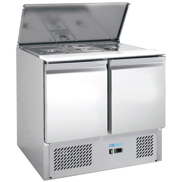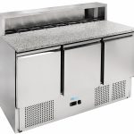 Saladette refrigerate con refrigerazione statica. Sbrinamento automatico – evaporatore statico schiumato su tre lati con ventola per uniformare la temperatura – coperchio ad apertura telescopica – termostato elettronico. Disponibili con pianetto di lavoro in polietilene alimentare – 1 griglia intermedia GN1/1 per porta – bacinelle escluse.