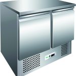 Saladette refrigerate per insalate – refrigerazione statica. Saladette refrigerate con refrigerazione statica. Struttura in acciaio inox AISI 304 – sbrinamento automatico – evaporatore statico schiumato su tre lati con ventola per uniformare la temperatura – coperchio ad apertura telescopica – termostato elettronico. Disponibili con pianetto di lavoro in polietilene alimentare o in acciaio inox AISI 304 – 1 griglia intermedia GN1/1 per porta – bacinelle escluse.