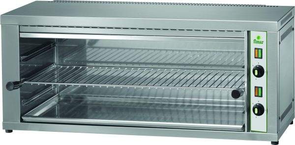 Macchina per scaldare, gratinare e tostare piatti. Struttura in acciaio inox – griglia cromata e cassetto raccolta residui di cottura removibili – termostati con 3 regolazione di potenza – regolazione posizione griglia.