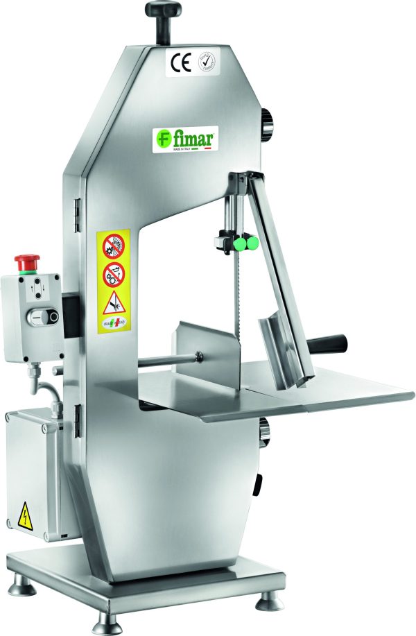 – porzionatore, piano di lavoro, guida lama e spingi carne in acciaio inox. Accessori: cavalletto in acciaio verniciato e confezione lame.