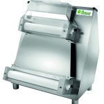 Macchina per stendere impasti all’uovo, pizza e piada. Struttura interamente in acciaio inox AISI 304 – rulli in acciaio inox AISI 304 lucidati a specchio – apertura rulli 0÷10 mm – pomello di regolazione spessore ultimo passaggio – microinterruttore su coperchio di protezione rulli.
