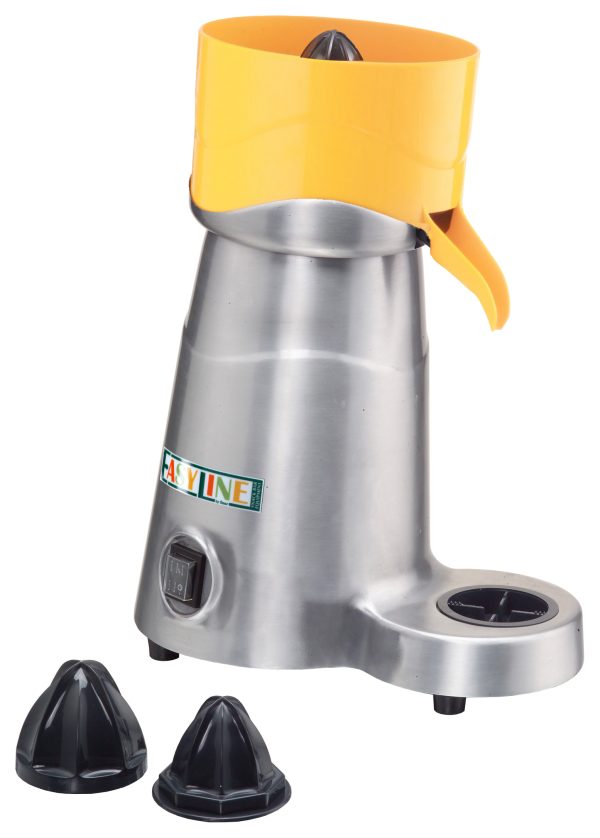 Macchina per spremere agrumi. Spremiagrumi elettrico in lega di alluminio satinato – vasca, filtro,paraspruzzi e pigne in plastica estraibili – tripla pigna.
