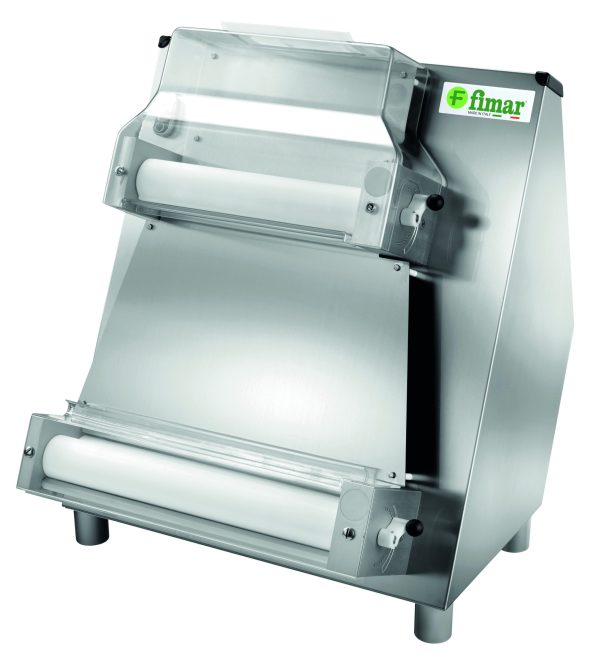 Macchina per stendere impasti di pizza, pane, piada, focacce, ecc. Struttura interamente in acciaio inox AISI 304 – rulli in resina alimentare – leva di regolazione spessore su entrambe i gruppi – apertura rulli da 0,3 mm a max 5,5 mm – rulli superiori inclinati (FI32N-42N) o paralleli (FIP42N) per realizzare diverse forme. Il sistema con micro di sicurezza si trova sul coperchio protezione rulli superiori e permette il funzionamento solo a coperchio chiuso.