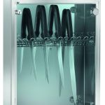 Armadietto sterilizzatore a raggi UV costruito in acciaio inox aisi 304 Scotch Brite. Portina in plexiglas trasparente con microinterruttore – portacoltelli in acciaio inox – funzionamento con lampada germicida con griglia di protezione temporizzatore 60’ e lampada spia di funzionamento – cavo con spina.