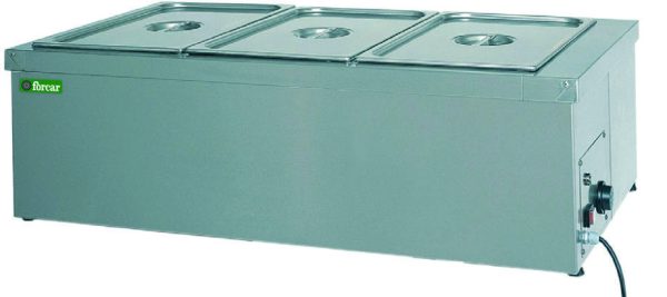 Tavole calde con resistenza a secco (senza acqua). Struttura in acciaio inox AISI 304 – parete coibentata- termostato regolabile. Le bacinelle sono escluse.