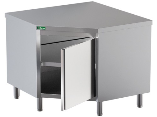 Tavoli armadiati ad angolo – con alzatina o senza alzatina. Struttura in acciaio inox – piano di lavoro in acciaio inox AISI 304 – ripiano intermedio regolabile con rinforzo ad Omega – alzatina h 100 mm tamburata – porte tamburate – pannello posteriore in acciaio Inox – piedini regolabili.