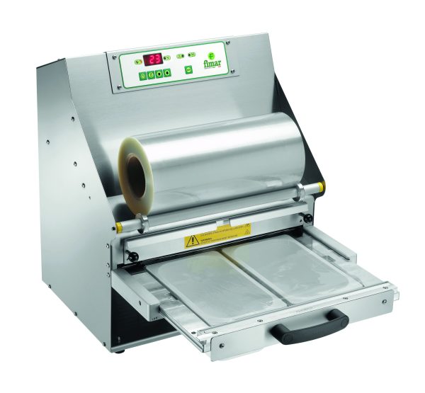 Macchina per termo sigillare gli alimenti dentro le vaschette, permettendo così di mantenere fragranza e gusto. Costruite in acciaio inox AISI 304 – piastra saldante interna per evitare scottature – trascinamento automatico del film senza alcun ausilio manuale – controllo elettronico della temperatura di saldatura per sigillare perfettamente le vaschette – non sono dotate di stampo di serie, è possibile sceglierne uno tra gli optional.