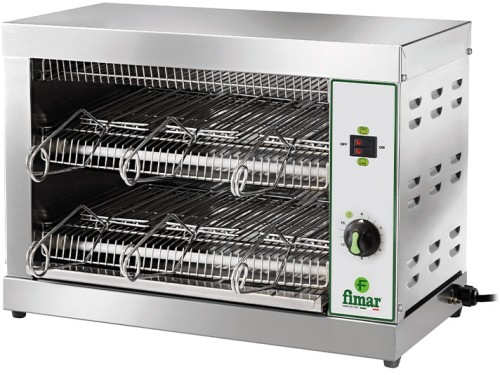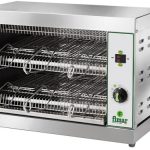 Macchina per riscaldare pizze, panini, cibi precotti, hamburger, würstel, toast farciti, piadine, ecc. Struttura in acciaio inox – funzionamento mediante resistenze con tubi al quarzo – timer 0÷15 minuti – capacità toast 6.