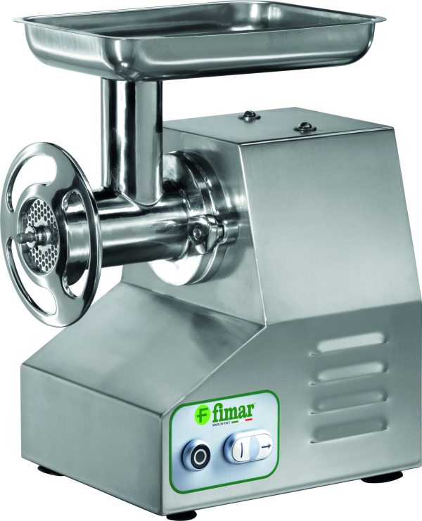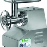 Carcassa e tramoggia in acciaio inox. Macchina con gruppo di macinazione completamente removibile, che permette di poterlo collocare in frigorifero senza che debba essere pulito dai residui di carne macinata dopo ogni utilizzo in conformità con le norme di igiene HACCP – il gruppo di macinazione in acciaio inox AISI 304 può essere lavato in lavastoviglie – comandi in bassa tensione – bocca ingresso carne ø 52 mm – inversione di marcia – riduttore con ingranaggi a bagno d’olio. In dotazione sistema enterprise con piastra inox (fori ø 6 mm) e coltello inox autoaffilante.