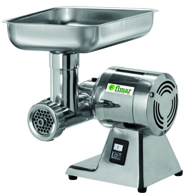 Struttura in alluminio lucidato con tramoggia in acciaio inox – gruppo macinazione in alluminio – bocca ingresso carne ø 52 mm – riduttore con ingranaggi a bagno d’olio – in dotazione sistema enterprise con piastra inox (fori ø 6 mm) e coltello inox auto-affilante.