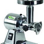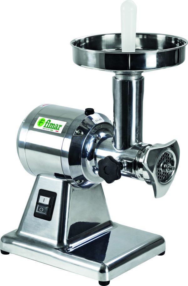 Struttura in alluminio lucidato con tramoggia in acciaio inox. Bocca ingresso carne ø 52 mm – riduttore con ingranaggi a bagno d’olio – in dotazione sistema enterprise con piastra inox (fori ø 6 mm) e coltello inox auto-affilante.