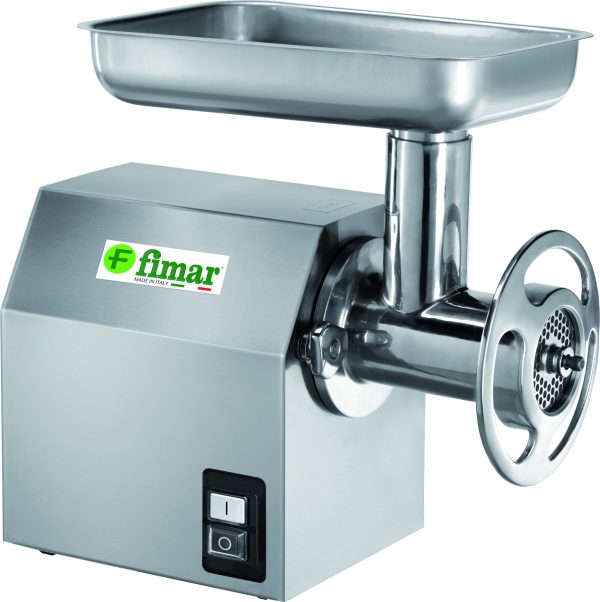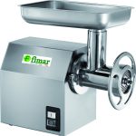 Carcassa e tramoggia in acciaio inox. Macchina con gruppo di macinazione completamente removibile, che permette di poterlo collocare in frigorifero – il gruppo di macinazione in acciaio inox AISI 304 può essere lavato in lavastoviglie – bocca ingresso carne ø 52 mm – riduttore con ingranaggi a bagno d’olio. In dotazione sistema enterprise con piastra inox (fori ø 6 mm) e coltello inox autoaffilante.