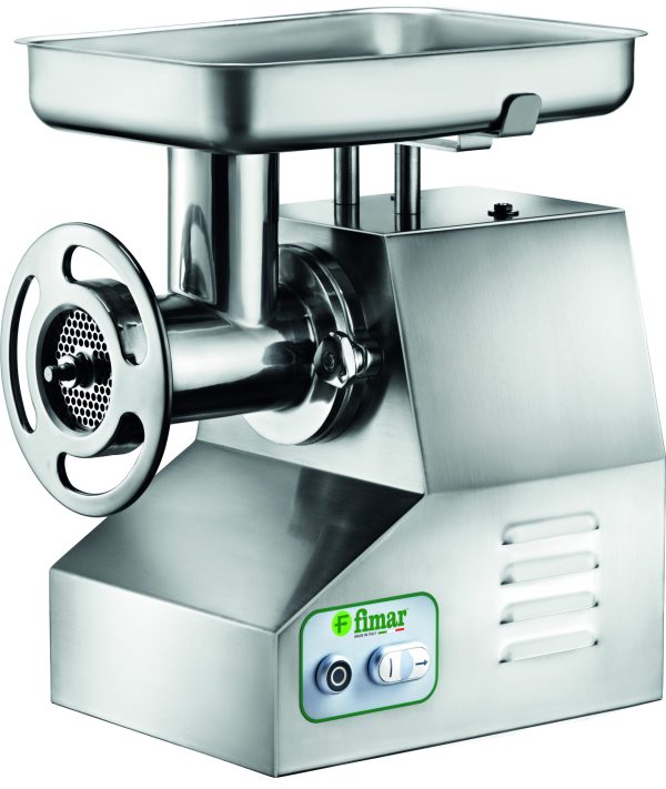 Carcassa e tramoggia in acciaio inox. Macchina con gruppo di macinazione completamente removibile che permette di poterlo collocare in frigorifero senza che debba essere pulito dai residui di carne macinata dopo ogni utilizzo in conformità con le norme di igiene HACCP – il gruppo di macinazione in acciaio inox AISI 304 può essere lavato in lavastoviglie – ventola di raffreddamento – bocca ingresso carne ø 76 mm – microinterruttori di sicurezza su tramoggia – inversione di marcia – riduttore con ingranaggi a bagno d’olio – comandi in bassa tensione – in dotazione sistema enterprise con piastra inox (fori ø 6 mm) e coltello inox autoaffilante.