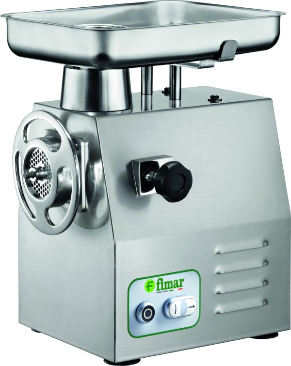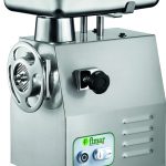 Carcassa e tramoggia in acciaio inox. Gruppo macinazione estraibile in acciaio inox AISI 304 – comandi in bassa tensione – bocca ingresso carne ø 64 mm – microinterruttori di sicurezza su tramoggia – inversione di marcia – riduttore con ingranaggi a bagno d’olio. In dotazione sistema enterprise con piastra inox (fori ø 6 mm) e coltello inox autoaffilante.